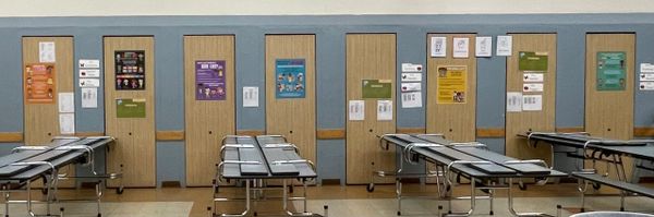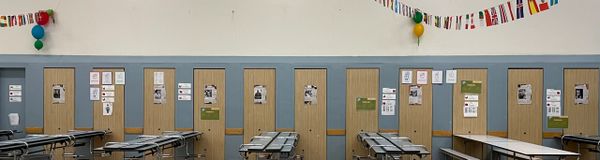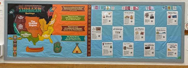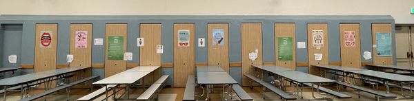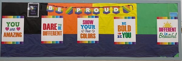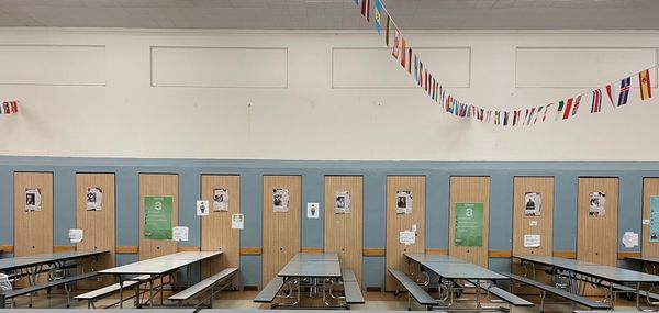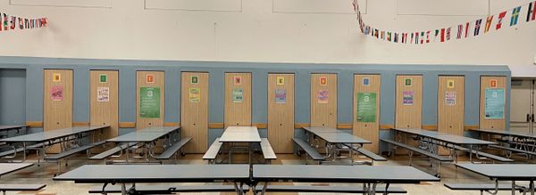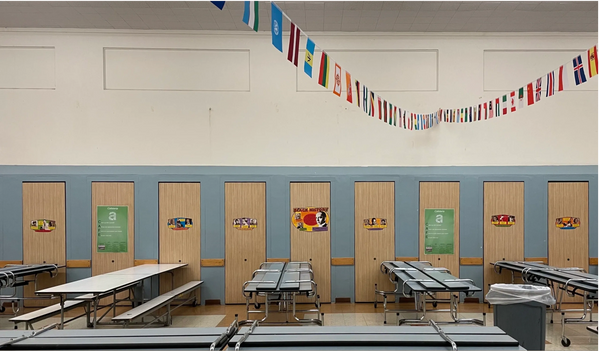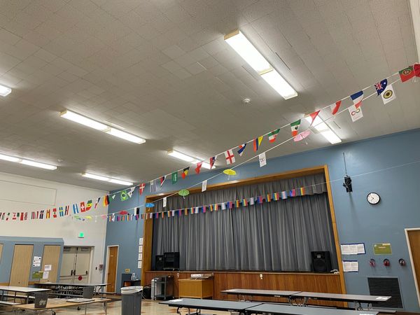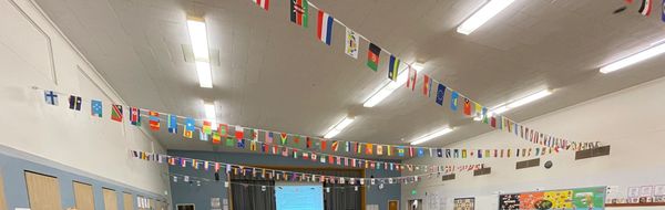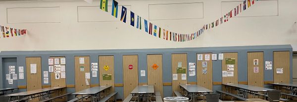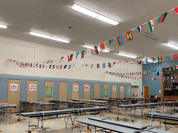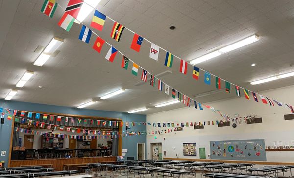 Flags Banner in cafeteria representing world countries (200+), Oregon's Indigenous People (11), Black Americans (2), LGBTQIA2S+ (10), and types of Neurodivergence (9)